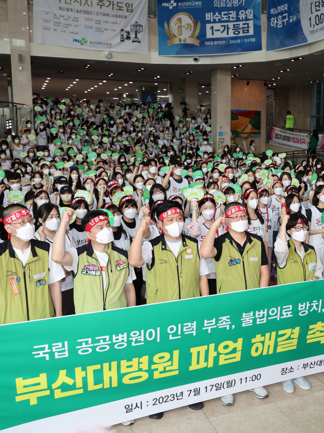 부산 서구 부산대학교병원 본원 로비에서 전국보건의료산업노동조합과 부산대병원 노조가 17일 합동으로 기자회견을 열고 병원 측에 파업 해결을 촉구하고 있다. 이재찬 기자 chan@