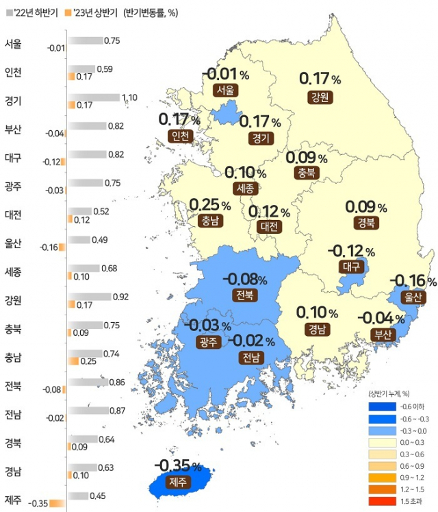 전국 시도 가운데 상반기 땅값이 가장 많이 떨어진 곳은 제주(-0.35%)였으며 이어 울산(-0.16%, 대구(-0.12%) 전북(-0.08%) 부산(-0.04%) 등의 순이었다.