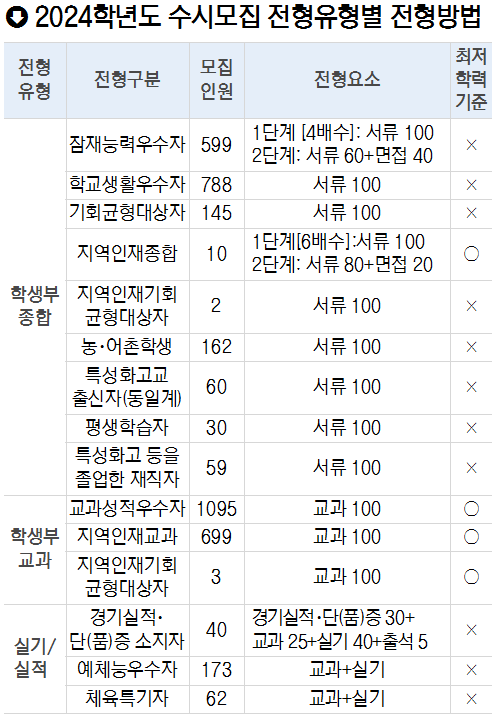 학생부종합전형에는 면접고사를 실시하는 잠재능력우수자전형과 학교생활기록부만으로 평가하는 학교생활우수자전형이 있다. 수능 최저학력 기준은 적용하지 않는다. 올해 전형에서는 지역인재종합전형을 신설해 의예과 10명을 선발한다. 1단계 학교생활기록부 100%를 반영하여 6배수를 선발, 2단계에서 1단계 성적 80%와 면접 20%를 반영하여 최종 선발한다. 수능 최저학력기준은 국어, 수학, 영어, 과학탐구(1개) 4개 영역 합 6등급 이내다. 잠재능력우수자전형의 경우 면접배수를 예년 3배수에서 4배수로 확대해 많은 수험생들에게 기회를 제공한다.