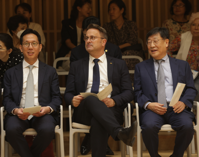 26일 오후 부산 수영구 금난새 뮤직센터를 찾은 룩셈부르크 자비엘 베텔(가운데) 총리와 고려제강 홍영철(오른쪽) 회장, 그리고 홍석표(왼쪽) 사장. F1963 제공