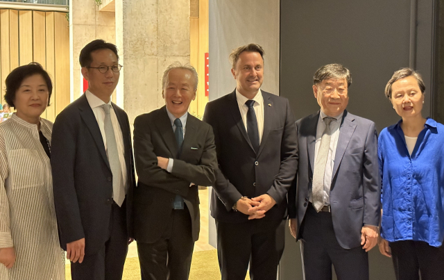 26일 오후 부산 수영구 금난새 뮤직센터를 찾은 룩셈부르크 자비에 베텔(왼쪽에서 네 번째) 총리가 고려제강 홍영철(오른쪽에서 두 번째) 회장, 지휘자 금난새(왼쪽에서 세 번째) 등과 기념 사진을 찍고 있다. 김은영 선임기자