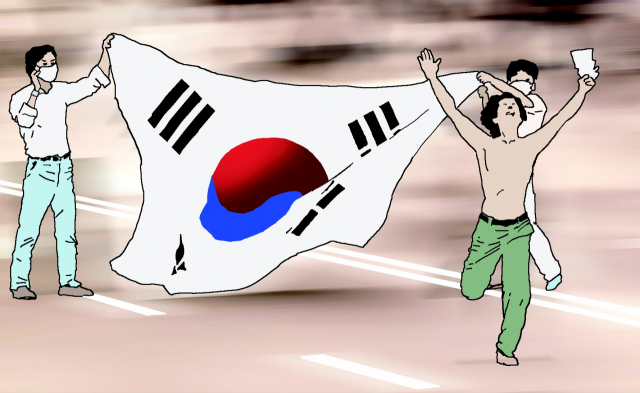 유사한 일이 ‘탱크맨’보다 이태 전, 우리나라 그것도 부산에서 있었다. 전두환 군사정권에 항거하는 민주화운동이 한창이던 1987년 6월 26일 오후의 일이다. 이날 부산 문현교차로에선 ‘국민평화 대행진’이라는 이름으로 시위가 열렸는데, 경찰이 최루탄을 쏘며 시위를 막았다. 그런데 갑자기 한 청년이 웃통을 벗은 채 뛰쳐나와 “최루탄을 쏘지 말라”고 외쳤다. 두 팔을 높이 올린 청년의 뒤에는 커다란 태극기가 펼쳐져 있었다.