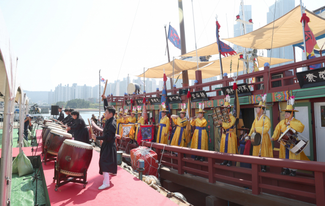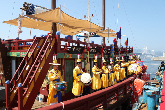 29일 오후 부산 남구 용호별빛공원 선착장에서 조선통신사선 운항을 앞두고 세리머니가 열리고 있다. 조선통신사선은 다음 달 1일 1811년 조선통신사의 12차 사행 이후 212년 만에 일본으로 떠날 예정이다. 정대현 기자 jhyun@