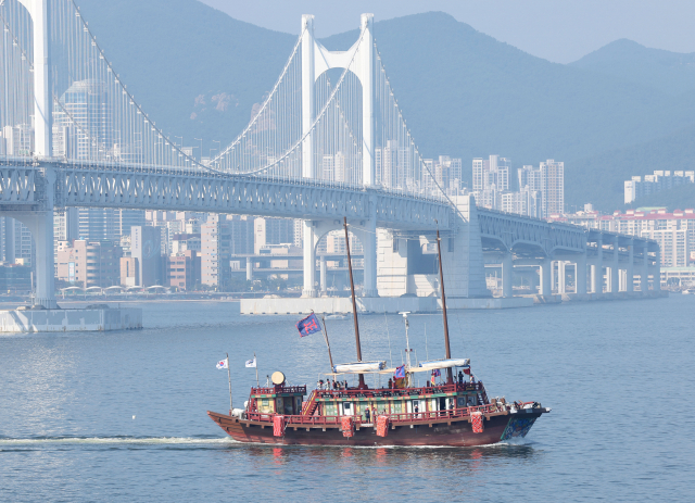 29일 오후 부산 앞바다에서 조선통신사선이 시범 운항을 하고 있다. 조선통신사선은 다음 달 1일 1811년 조선통신사의 12차 사행 이후 212년 만에 일본으로 떠날 예정이다. 정대현 기자 jhyun@