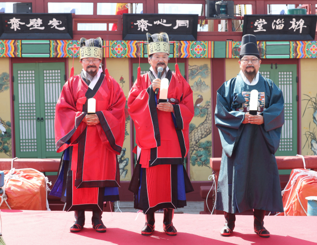 28일 영가대 해신제가 끝나고 참여한 3헌관과 제관들이 기념사진을 찍고 있다. 김은영 선임기자