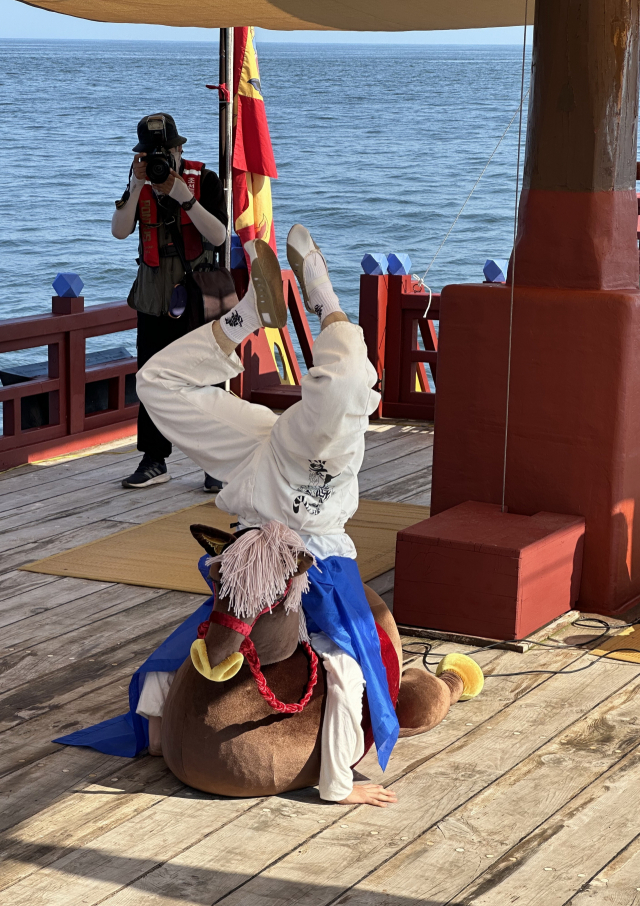 조선통신사선 출항 세리머니 선상에서 맛보기로 부산예술단의 '마상재' 묘기. 김은영 선임기자