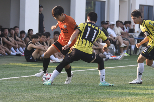 지난 29일 경남 고성군 스포츠파크 4구장에서 열린 제60회 청룡기 전국고교축구대회 8강전 경남 범어고와 경기 과천고의 경기에서 양 팀 선수들이 공을 다투고 있다. 범어고가 1-0으로 이겼다.