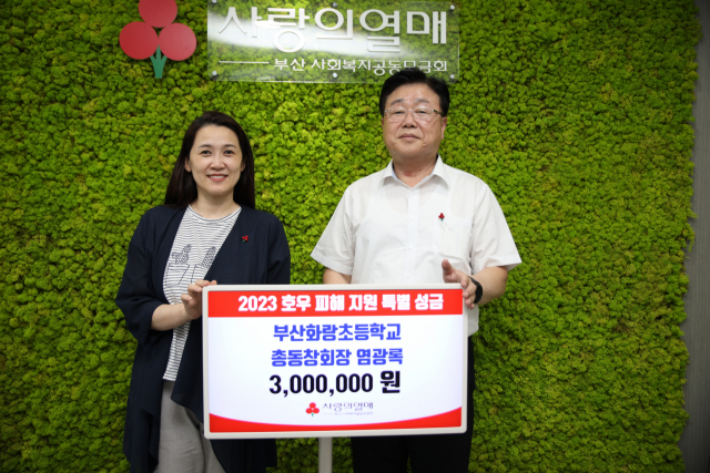 부산화랑초등학교 염광록 총동창회장은 지난달 28일 호우 피해 주민들을 돕기 위하여 성금 300만 원을 부산사회복지공동모금회(회장 최금식·부산사랑의열매)에 전달했다.