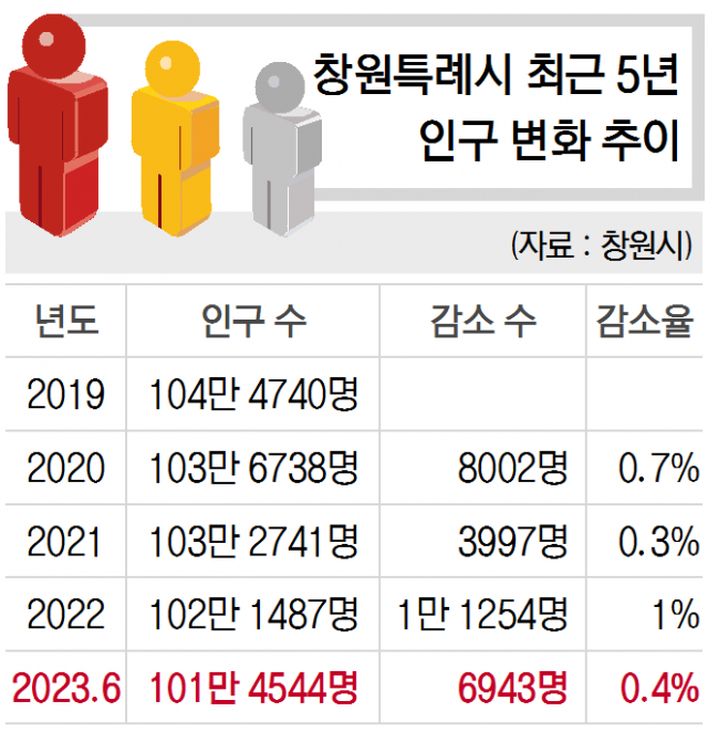 그런데 계속된 인구 유출로 특례시 지위가 위태롭다. 최근 5년간 창원시 인구(외국인 제외)는 2019년 104만 명에서 줄곧 내리막이다. 지난 6월 현재 101만 명으로 겨우 100만 명 선을 유지하고 있다. 문제는 출생률 감소와 청년 인구 유출이다. 2020년부터는 사망자 수가 출생자 수를 뛰어넘는 ‘데드크로스’ 현상까지 나타났다.