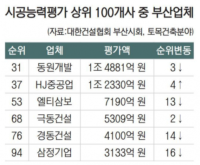 시공능력평가 100위 안에 부산 업체는 6개사가 자리했다. 동원개발(31위), HJ중공업(37위), 엘티삼보(53위), 극동건설(68위), 경동건설(76위), 삼정기업(94위)다.