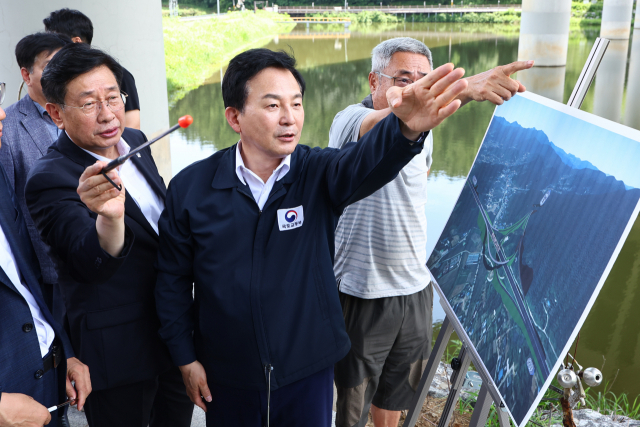 원희룡 국토교통부 장관이 27일 오전 경기도 양평군 강상면 서울-양평 고속도로 대안노선 종점 인근을 방문해 현장 점검을 하던 중 주민과 대화를 나누고 있다. 연합뉴스
