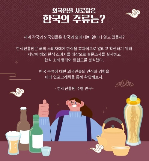 외국인들이 가장 많이 마셔본 한국 술은 소주가 1위였고 한국 술을 마시는 이유로는 ‘맛있어서’를 가장 많이 꼽았다.
