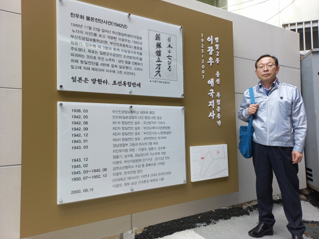 이상국 위원이 부친인 이광우 애국지사를 소개한 게시판 앞에 서있는 모습. 동구문화원 이상국 전문위원 제공