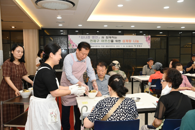 김나경전통음식연구소(대표 김나경)와 환토리연구소(소장 김지권)는 지난달 28일 연제구(구청장 주석수)의 저소득 홀몸 어르신 50명을 위해 ‘사랑의 삼계탕 나눔’ 행사를 가졌다.