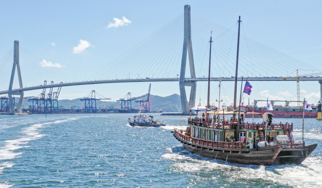 새롭게 복원된 조선통신사선이 1일 오전 부산 중구 연안여객터미널에서 일본을 향해 출항하고 있다. 평화의 사절단으로 조선과 일본 양국을 오간 조선통신사선이 대한해협을 건너 일본 쓰시마에 입항하는 것은 212년 만이다.