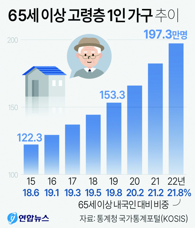 3일 통계청 인구주택총조사에 따르면 작년 11월 기준 65세 이상 내국인은 904만 6000명이었다. 이 중 1인 가구는 197만 3000명으로 21.8%를 차지했다. 노인 5명 중 1명은 혼자 거주하는 셈이다. 노인 1인 가구 수와 비중은 역대 최대 수준이다.