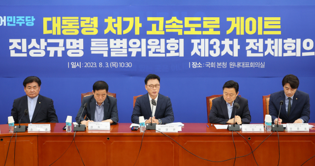 더불어민주당 박광온 원내대표가 3일 국회에서 열린 ‘대통령 처가 고속도로 게이트 진상규명 특별위원회’ 3차 전체회의에서 발언하고 있다. 연합뉴스