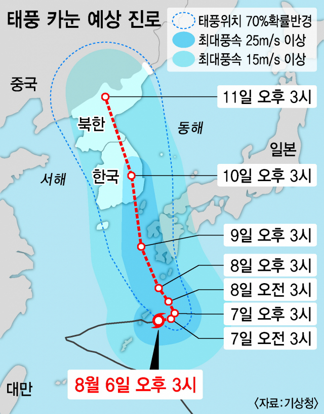 기상청은 6일 오후 4시 "태풍 ‘카눈’이 10일 낮 부산 쪽으로 상륙한 뒤 같은 날 오후 3시 대구 북쪽 약 50km 지점까지 올라올 것"이라고 전망했다. 대구 북쪽 상륙 때까지 태풍 강도는 중심 초속 25~32m인 ‘중’을 유지할 것으로 내다봤다.