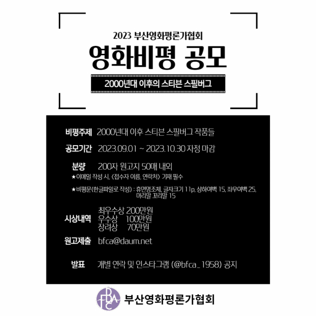 부산영화평론가협회는 영화 담론의 지평을 확대하고 진취적이고 도전적인 영화평론가를 발굴하기 위해 ‘2023 비평 공모전’을 연다. 올해 주제는 ‘2000년대 이후 스티븐 스필버그 영화들’로 다음 달 1일부터 10월 30일 자정까지 비평문을 접수한다.