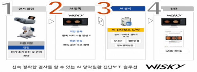 ‘WISKY’는 인공지능 기술로 안저영상을 분석해 실명으로 이어질 수 있는 망막질환인 황반변성, 녹내장, 당뇨망막병증을 동시에 분석하는 국내 첫 제품으로, 기술 혁신성과 망막질환 환자 증가 추세에 따른 시장 창출 가능성 등을 인정받아 혁신의료기기로 지정됐다. 황반변성·녹내장·당뇨망막병증은 초기 증상이 거의 없어 조기 발견이 어려운데, AI 망막 진단 플랫폼인 ‘WISKY’는 빠르게 결과를 제공해 골든타임을 잡는다.