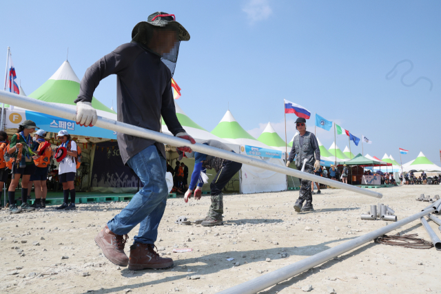 세계스카우트연맹이 잼버리 대회가 열리는 전북 부안군에서 조기 철수를 결정한 7일, 행사 관계자들이 부스 앞에 설치된 그늘막을 해체하고 있다. 연합뉴스