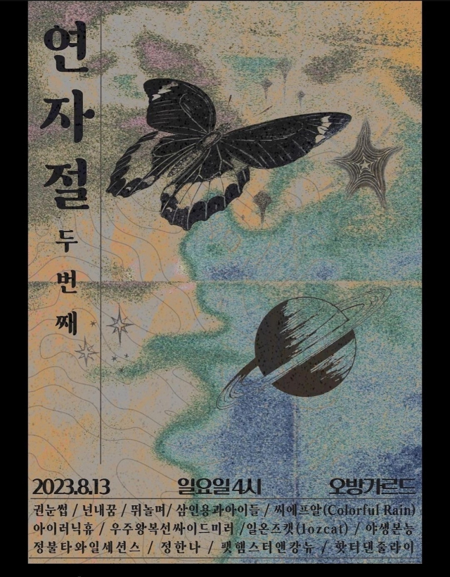정 대표는 “8월은 대형 음악 축제가 가장 많이 열리는 시즌인데, 시간이나 비용 때문에 가기 힘든 분이 많다”며 “연자절에 와서 즐거운 에너지를 받아 관객과 아티스트 모두가 행복한 마음을 채우고 가길 바란다”고 기획 의도를 설명했다. 공연장은 부산 남구 용소로7번길 15-1 지하 오방가르드. 참가 신청은 구글 폼(url.kr/7ryst1)을 작성한 후 입장료를 보내면 된다. 예매는 1만 5000원, 현장 판매는 2만 원이다.