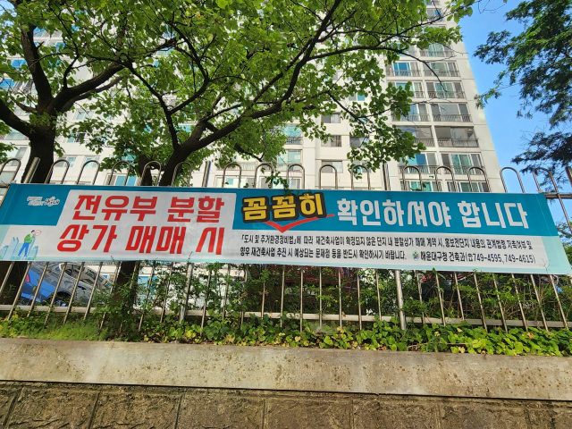 현수막 게시는 지난달 대우마리나 아파트 입주민과의 면담에서 나온 상가 쪼개기 갈등 대책의 일환이다. 이 자리에서 구청 측은 법령상 미흡한 점에 대해 시정 조치를 요구하고 아파트 일대에 거래를 주의해야한다는 내용의 현수막을 게시하겠다고 밝혔다.