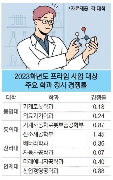 공대 인기가 시들해져 프라임 사업에 참여하지 않은 대학들은 공대 구조조정, 학과 통폐합 등을 단행하며 학생 모집을 해나갔지만, 이들 대학은 ‘프라임의 저주’라고 불리며 공대생 모집에서 어려움을 겪었다. 올해 신입생 정시 모집에서 동명대는 프라임 사업 대상학과인 기계로봇학과는 경쟁률이 0.18 대 1, 의료기기학과 0.24 대 1, 해양모빌리티학과는 0.33 대 1을 기록하는 최악의 성적표를 받아들었다. 신라대는 공대 정시전형 정원 79명 모집에 48명이 응시하며 31명의 결원이 발생했다. 인제대의 경우도 프라임 사업 관련 학과 12개 학과 중 전자·기계자동차공학부, 산업경영공학과, 미래에너지공학과는 정시에서 신입생을 모두 충원하지 못했다. 전통적으로 공대가 강했던 동의대도 정시 모집에서 기계자동차로봇부품공학부, 신소재공학부가 각각 경쟁률 0.87 대 1, 1.45대 1을 기록하며 신입생 모집에 애를 먹었다.