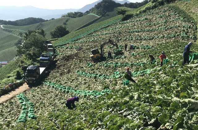 올여름 긴 장마와 폭염 등으로 배추와 무 가격이 한달 전에 비해 크게 올랐다. 사진은 고랭지 배추 수확장면. 농식품부 제공