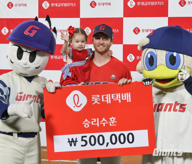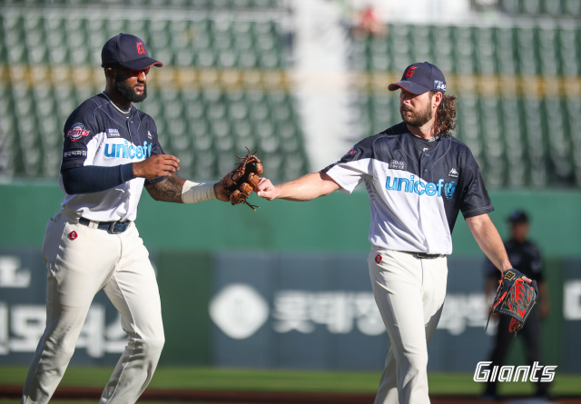 롯데 자이언츠 투수 애런 윌커슨(오른쪽)은 지난 11일 KIA 타이거즈와의 경기에 선발 투수로 나서 6이닝 무실점으로 시즌 2승을 기록했다. 롯데 자이언츠 제공