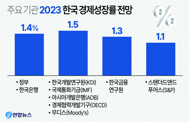 반면, 정부나 중앙은행인 한국은행은 성장률 전망치를 2%대로 내다보고 낙관하고 있다. 정부는 지난달 초 '2023년 하반기 경제정책방향'을 발표하면서 내년 성장률 전망치로 2.4%를 제시했다.