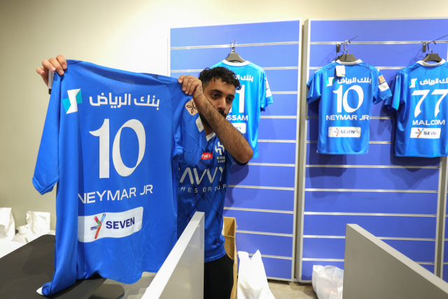 사우디아라비아 프로축구 알 힐랄 관계자가 16일 입단한 네이마르의 유니폼을 들어 보이고 있다. AFP연합뉴스