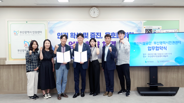 이날 협약식에서 양 기관은 △부산시민의 인권 향상을 위한 정책 제안과 연구 △부산 지역 인권 교육 활성화 △부산 시민의 인권 침해 상담과 자문 등에 관한 업무 △부산시설공단 인권·성평등 사안 고충 상담 지원 업무 등에 대한 상호 협력을 약속했다.