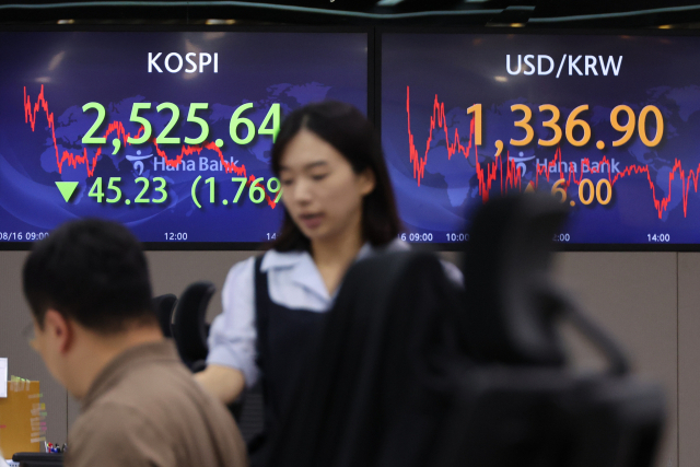 코스피는 16일 전장보다 45.23포인트(1.76%) 내린 2525.64, 원·달러 환율은 6.0원 오른 1336.9원에 마감했다. 연합뉴스