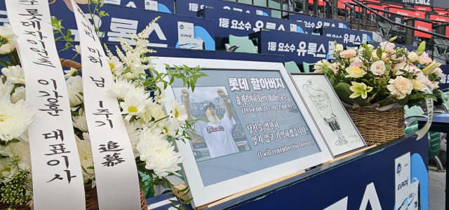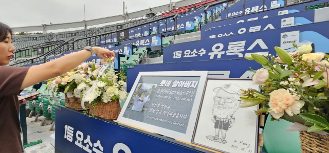 16일 롯데와 SSG 랜더스의 경기가 열리는 부산 사직구장 121블럭 4열 8-11번 좌석에는 마허 전 교수를 추모하는 조화와 사진, 캐리커처 그림이 놓였다. 롯데 팬들은 좌석에 놓은 고인의 영정 사진을 보며 사진을 찍고 감사의 인사를 전했다.