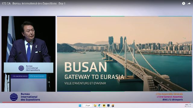 지난 6월 프랑스 파리 제172차 국제박람회기구(BIE) 총회장에서 179개 BIE 회원국 대표들이 참석한 가운데 우리나라의 4차 경쟁 프레젠테이션(PT)이 진행됐다. 윤석열 대통령이 마지막 PT 연사로 나서 발표하고 있다. BIE 공식 유튜브 채널 캡처