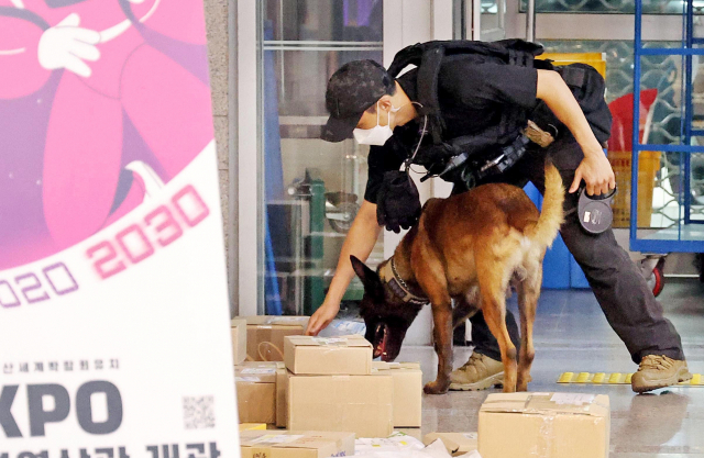 부산시청을 비롯해 전국 관공서와 대학 등을 폭파하겠다는 테러 예고가 경찰에 신고된 16일 오전 경찰이 탐지견을 동원해 부산시청사 내부를 수색하고 있다. 이재찬 기자 chan@