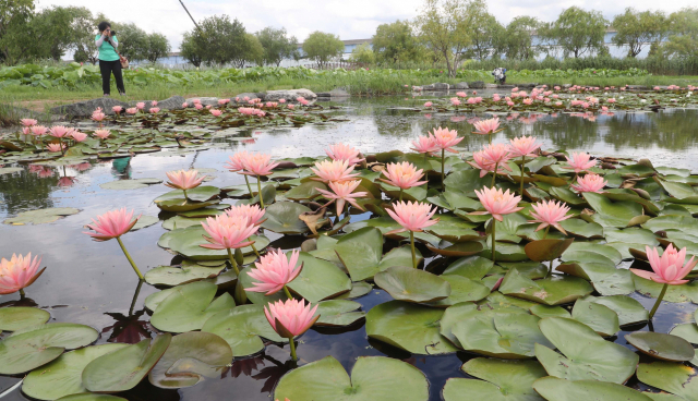 부산 사상구 삼락생태공원에 조성된 연꽃단지를 찾은 시민들이 꽃망울을 활짝 터트린 연꽃을 카메라에 담고 있다. 부산일보DB