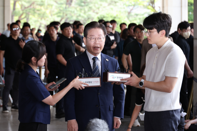 이 대표는 이날 오전 서울 서초동 서울중앙지검 인근 법원삼거리에 도착한 뒤 지지자들과 인사를 나누고 단상 위에 올라 준비한 메시지를 읽었다. 그는 “벌써 네 번째 소환”이라며 “저를 희생제물 삼아 정권의 무능과 정치 실패를 감춰보겠다는 것 아니겠느냐. 없는 죄를 조작해 뒤집어씌우고 자신들의 치부를 가리겠다는 정치검찰의 조작 수사 아니겠느냐”고 주장했다.