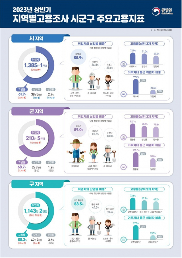 한편 전국적으로는 9개 도내 시 지역의 고용률은 61.9%로 작년 같은 기간보다 0.8%포인트(p) 상승했다. 이는 관련 통계 작성이 시작된 2013년 이후 역대 가장 높은 것이다. 도 내 군 지역의 고용률은 0.3%p 상승한 68.7%로 역시 가장 높았다. 취업자 수는 도 내 시 지역이 1385만 1000명, 군 지역이 210만 5000명으로 각각 24만 명, 1만 1000명 늘었다.