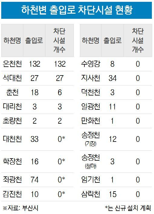 지방하천 18곳에는 403개의 출입로가 있는데, 이 중 진출입 차단시설은 170개에 불과하다. 이마저도 132개는 도심 하천인 온천천에 집중돼있다. 온천천에는 128개의 자동 차단시설과 4개의 수동 차단시설이 설치돼있다. 온천천을 제외한 17개 하천의 차단시설 설치율은 14%에 불과한 실정이다.