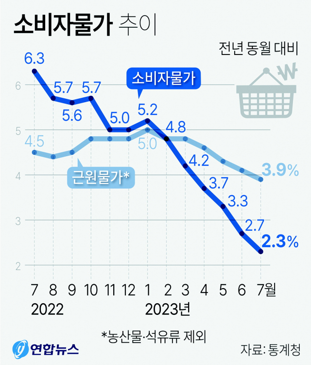 올해 소비자물가 상승률은 지난 1월 5.2%이던 것이 2월 4.8%, 4월 3.7%, 6월 2.7%로 갈수록 안정됐다. 7월에는 2.3%로 2021년 6월(2.3%) 이후 25개월 만의 가장 낮았다.