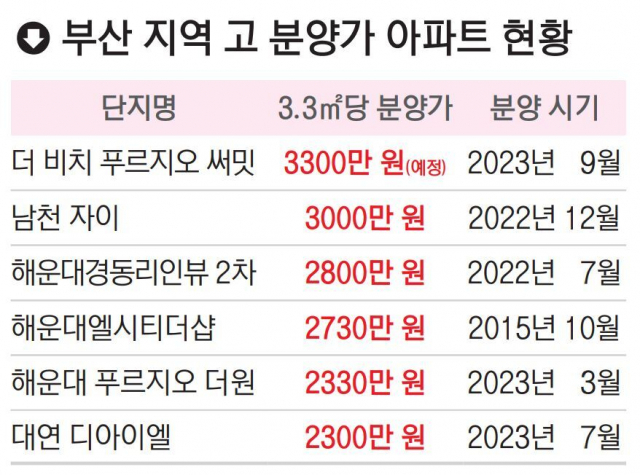 이는 역대 부산 최고 분양가다. 지금까지 3.3㎡당 부산 최고 분양가는 지난해 12월 분양한 남천 자이로 3.3㎡당 3000만 원이었다. 그 뒤로 해운대경동리인뷰 2차가 3.3㎡당 2800만 원, 해운대엘시티더샵이 3.3㎡당 2730만 원, 해운대 푸르지오 더원이 3.3㎡당 2330만 원, 대연 디아이엘이 3.3㎡당 2300만 원 순이었다.