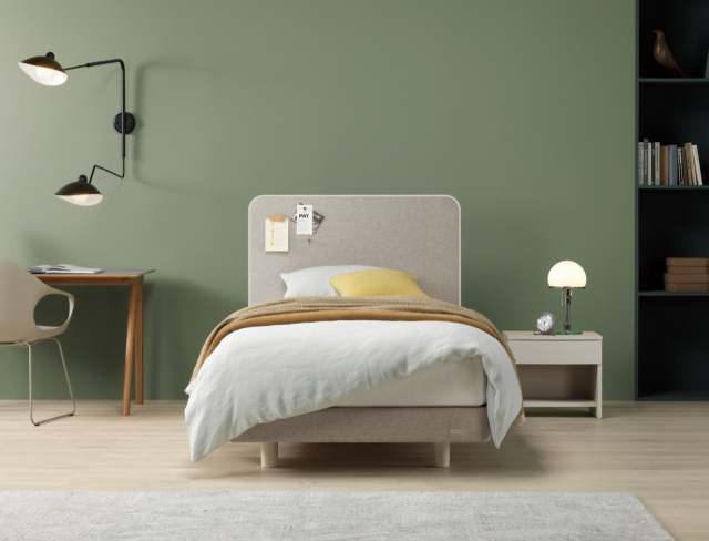 신제품 ‘바치오’는 이태리어로 ‘이마에 가볍게 키스하다’라는 뜻으로, 헤드보드 전면에 포스터, 엽서, 포토카드 등 원하는 소품을 자석을 활용해 자유롭게 부착할 수 있다. 나만의 스타일로 꾸밀 수 있는 것은 물론, 어떠한 인테리어와도 자연스럽게 매치할 수 있도록 모던한 ‘알파카베이지’와 트렌디한 ‘버뮤다블루’ 두 가지 컬러 중 선택할 수 있다.