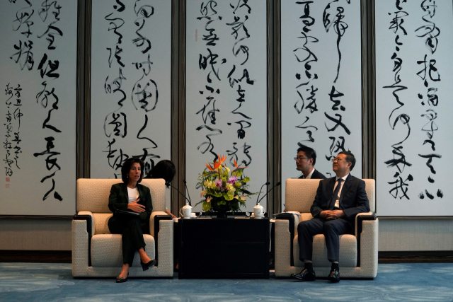지나 러몬도(왼쪽) 미국 상무부 장관이 30일 중국 상하이에서 천지닝 상하이시 당 서기와 회담하고 있다. 로이터연합뉴스