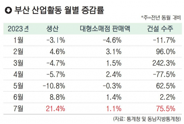 31일 동남지방통계청이 발표한 7월 부산지역 산업활동 동향에 따르면 부산의 광공업 생산 지수는 98.6(2020년=100)이다. 지난해 같은 달과 비교해 21.4% 줄어든 수치다. 소비(대형 소매점 판매)는 1.1%, 투자(건설 수주)는 75.5% 감소했다. 생산과 소비, 투자에서 모두 감소세가 나타난 이른바 ‘트리플 감소’다.