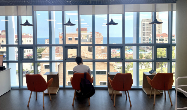 강동바다도서관 3층 자료실에서 한 이용객이 바다가 보이는 창가에 앉아 독서를 즐기고 있다. 권승혁 기자