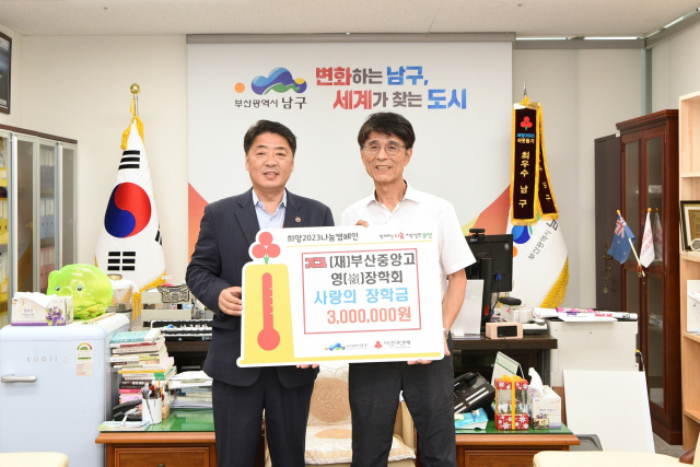 부산 남구청(구청장 오은택)은 지난달 30일 남구청에서 (재)부산중앙고 영장학회 이재우 이사장 등이 참석한 가운데 중학생들을 위한 장학금 300만 원 전달식을 가졌다.