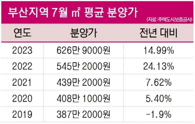 부산지역 아파트 분양가는 매년 가파르게 상승 중이다. 지난해 7월 ㎡당 아파트 분양가는 545만 2000원, 2021년 ㎡당 아파트 분양가는 439만 2000원, 2020년 7월 ㎡당 아파트 분양가는 408만 1000원, 2019년 7월 ㎡당 아파트 분양가는 387만 2000원이다. 5년 만에 분양가가 두 배 가까이 상승한 셈이다.