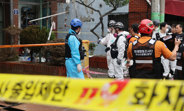 폭발사고로 소방관과 구청 공무원, 경찰, 시민 등 20여 명의 부상자가 발생한 부산 동구의 한 목욕탕 사고 현장에서 2일 국과수와 소방, 경찰 등 유관 기관이 합동으로 현장 감식을 진행하고 있다. 정종회 기자 jjh@